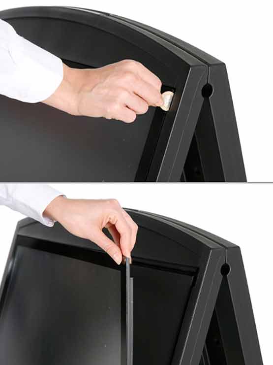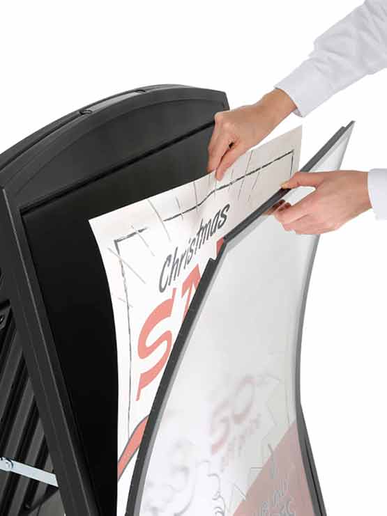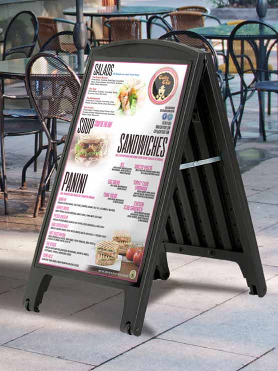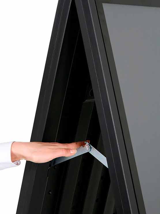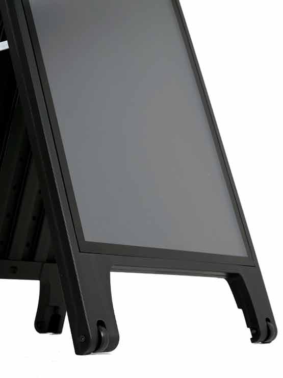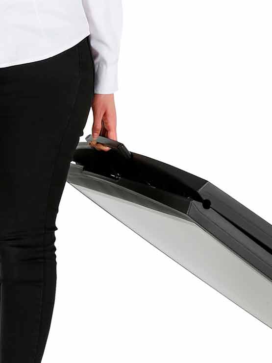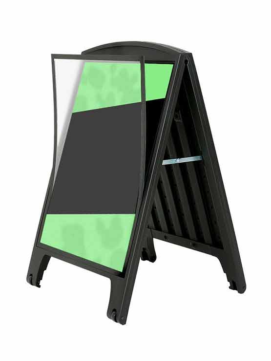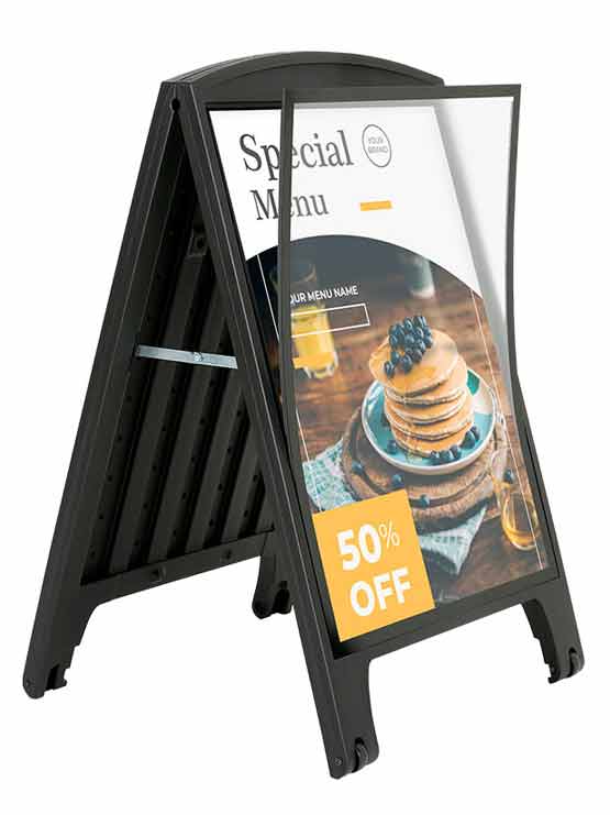 Caballete negro de plástico de doble cara y fabricado en plástico duradero. Es ligero y resistente a las condiciones climáticas de exterior. Además, consta de un asa para su fácil transporte y una lámina protectora antibrillo que permite la lectura bajo la luz directa. Es plegable, por lo que es perfecto para ocupar poco espacio. El Caballete de Acera Derby es ideal para ser utilizado en terrazas de restaurante, bares, cafeterías…