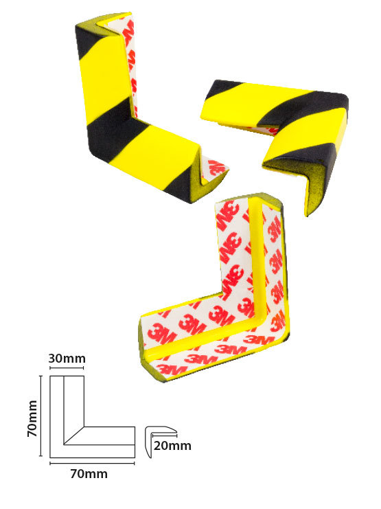 Cantoneras de espuma fabricadas con espuma de poliuretano de alta densidad de color amarillo con franjas oblicuas de color negro tipo emergencia, gran resistencia al impacto volviendo a su estado y características originales después del golpe. Lados de 70 milímetros de ancho, 20 milímetros de interior. Se venden por unidades.