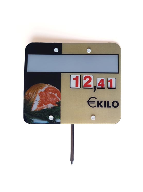 La zona derecha de un color beige de fondo, muestra en la parte inferior el literal en color negro € KILO y el precio mediante cuatro dígitos separados por una coma. Los dígitos de las unidades tienen una altura de 10 milímetros y los de los decimales de 8 milímetros, ambos en color rojo sobre fondo blanco que contrasta con el conjunto y le confiere una apariencia agradable y elegante.