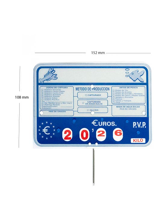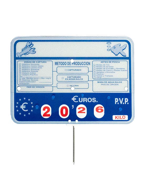 Otros carteles de precio y productos interesantes pueden ser Portaprecios Pescadería con Pincho, Portaprecios Pescadería Rotulado, Peana para Carteles con Pincho de Acero, Cartela para portaprecios pescadería sujeción pincho, Cartel de precios para Pescaderías