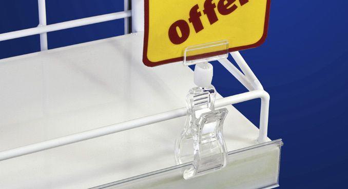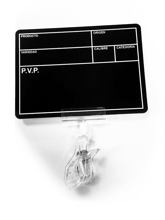 La pinza está fabricada en plástico transparente y formada por la propia pinza en el extremo inferior de 25mm de ancho y un accesorio superior donde colocamos la cartela unidos por una rótula que permite orientarlos en cualquier dirección. Permite acoplarse a cestas de frutas, mostradores, vitrinas y a casi cualquier sitio para poner un precio en su frutería. También existen otros tamaños de de pinza para combinar con éste u otros carteles (90 mm, 95 mm, 155 mm, 205 mm).