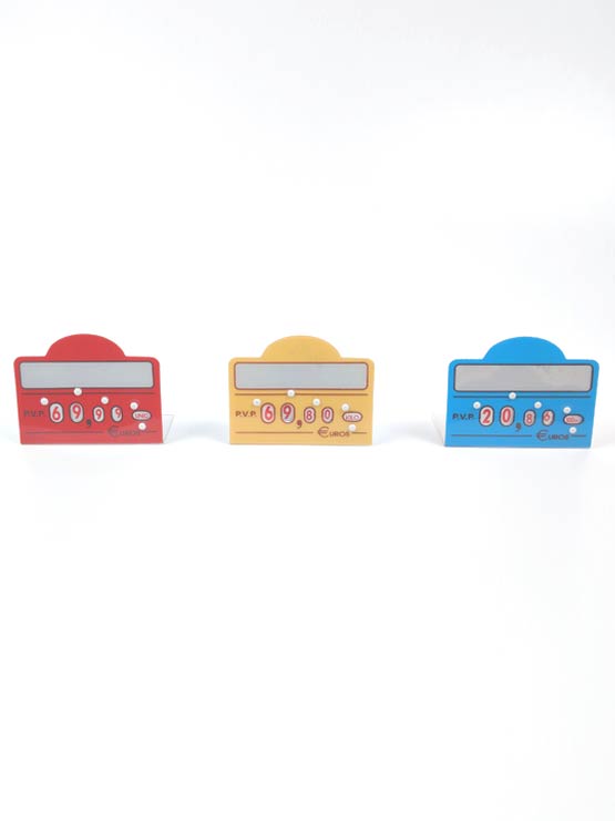 Es un modelo pequeño que dispone de una forma rectangular con un semicírculo en la parte superior. Las medidas de este magnífico porta precios son 85 x 65 mm y dispone de una zona blanca en la parte superior con un espacio aproximado 75 x 15 milímetros para poner el nombre del producto por ejemplo, utilizando rotuladores no permanentes de borrado fácil. Tiene una configuración en L inclinada con un base transparente de unos 85 x 35 mm.