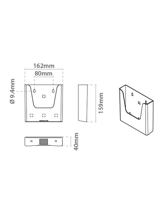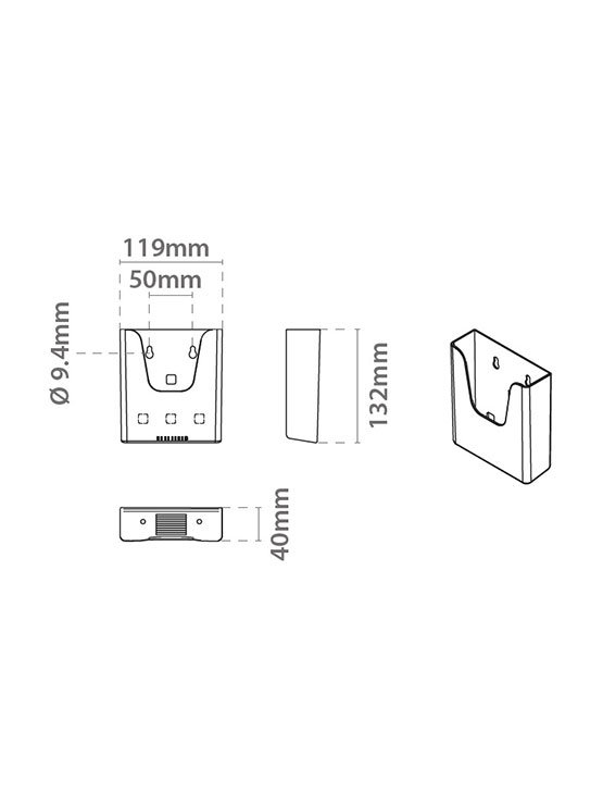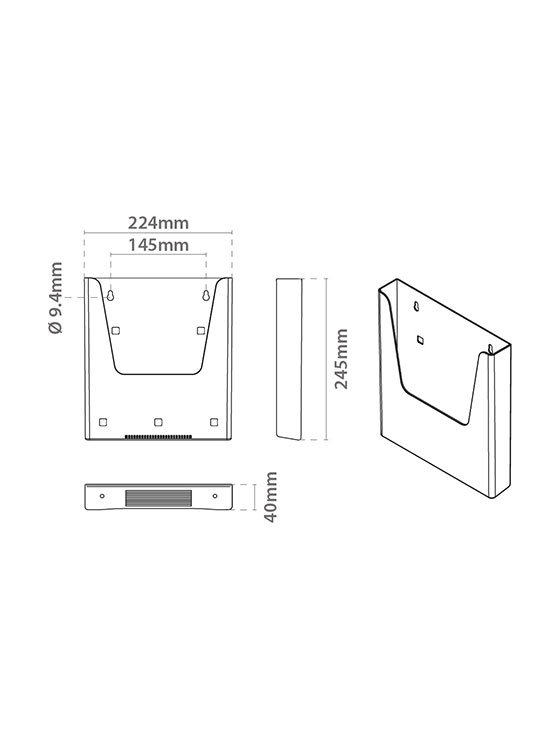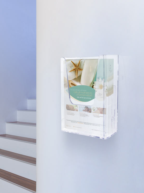 Porta catálogos de plástico transparente disponible en tres medidas para colocar en sobremesa, fijar con tornillos o colocar con ventosas. Tienen un espacio de 40 mm de fondo para colocar folletos o catálogos. Formato vertical. Buena visibilidad para publicidad, ofertas, folletos, catálogos, etc. Altamente resistentes y ligeros. Con su formato y posibilidades, estos expositores de catálogos son ideales para dejar publicidad, ofertas y recordatorios encima de una mesa, mostrador, cerca de la caja registradora, cerca de la entrada o salida, etc. Asegúrese de que los clientes acceden a información importante y relevante de su firma.