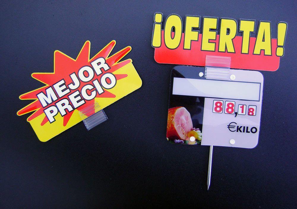 Gorros Promocionales para carteles, pequeña pieza fabricada en plástico transparente que actúa de doble pinza destinada normalmente para ser colocada en la parte superior de carteles o portaprecios para resaltar especialmente una oferta. Disponible en cuatro modelos diferentes: Dos carteles impactantes, troquelados, uno con la palabra OFERTA y otro con MEJOR PRECIO, y dos tamaños de cartel cuadrado con los bordes redondeados con la palabra Oferta en color rojo sobre fondo amarillo.
