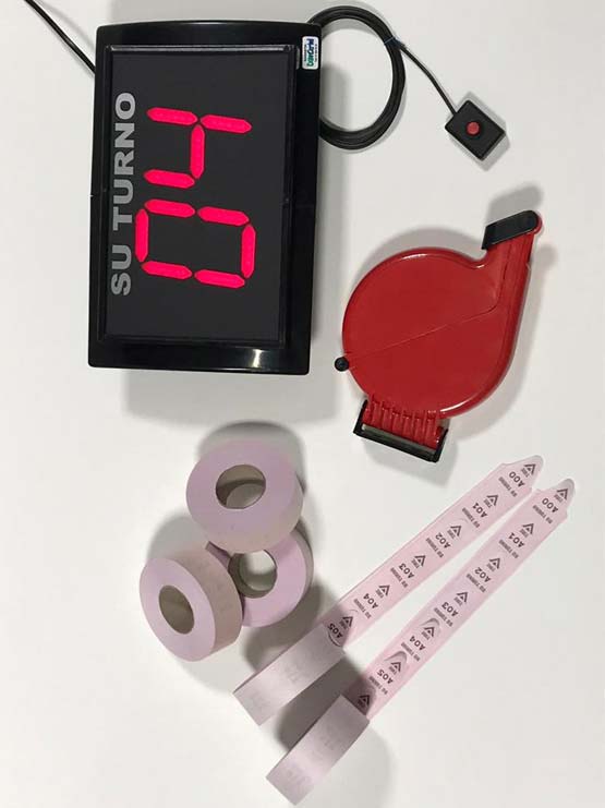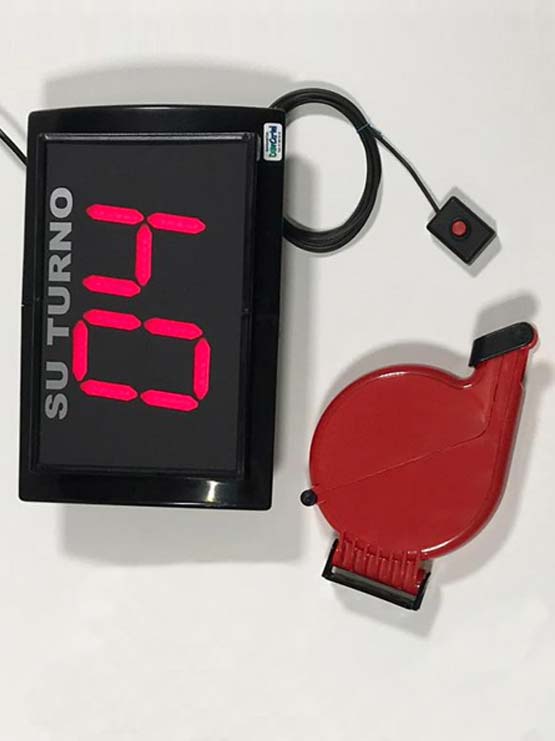 Kit completo con mando por cable que se compone de pantalla su turno, mando con cable, expendedor y cinco rollos de tickets. Su Turno fabricados en material plástico de alta resistencia y durabilidad, otra opción de toda nuestra familia de pantallas de turno. Sistema de turno con mando por cable que dispone de botón para añadir uno al número visionado en la pantalla y atender al cliente siguiente.