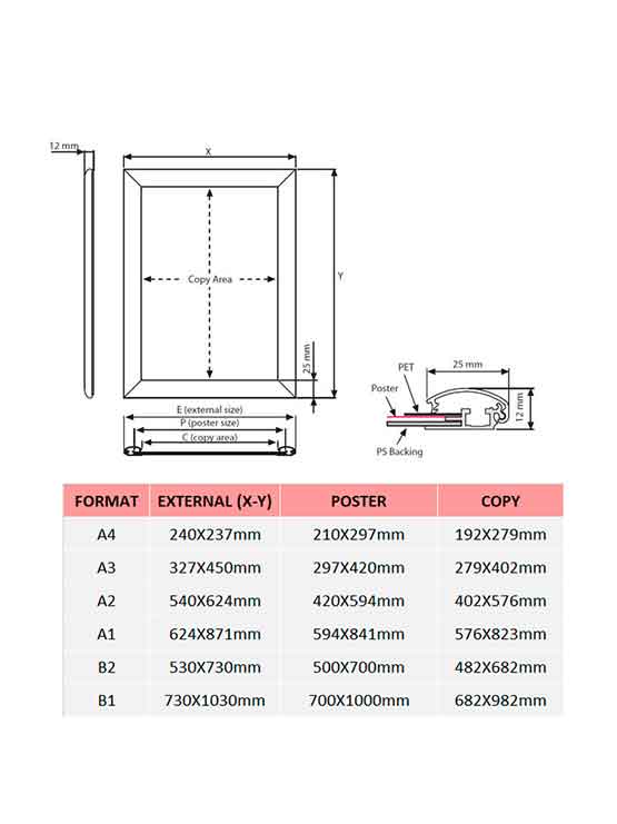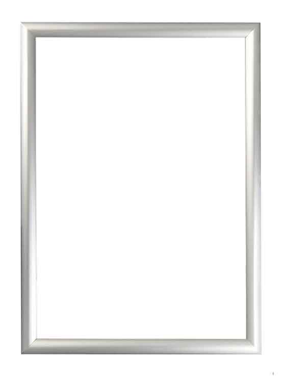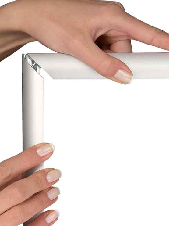 Marco perfil 25 mm de aluminio anodizado redondo y esquinas ingletadas. Disponible en tamaños diferentes. Tiene un sistema de click para cambiar las gráficas de forma rápida y fácil. Incluye lámina protectora antibrillo. Además, cada marco incluye accesorios para su montaje en pared (4 tornillos y 4 tacos). Los ganchos opcionales permiten un montaje sencillo.
