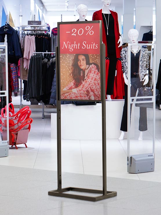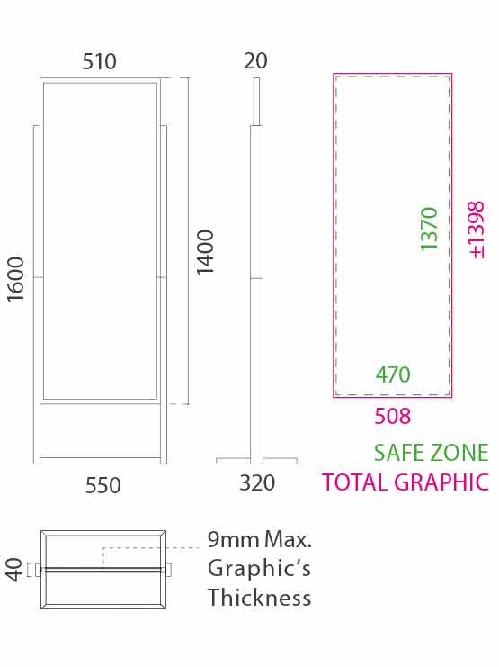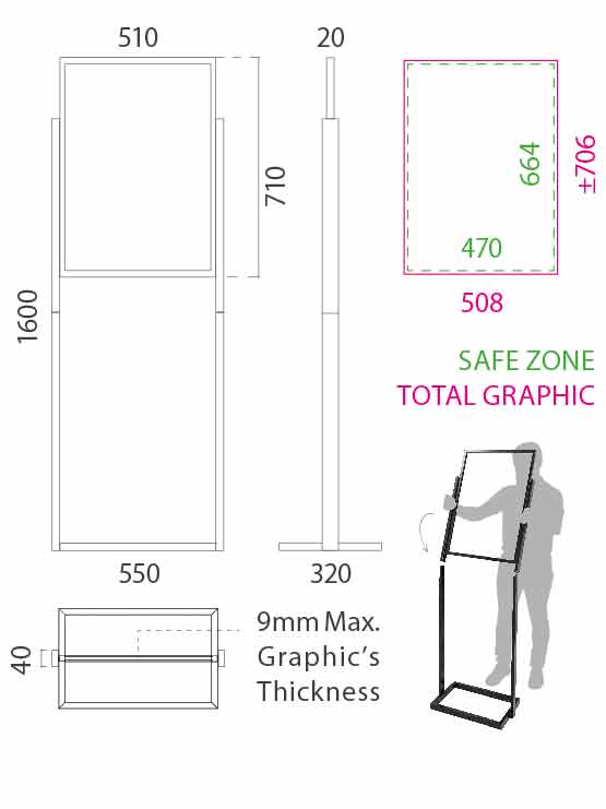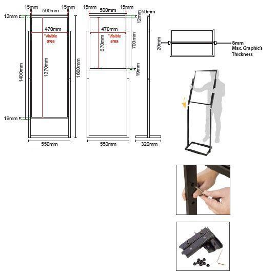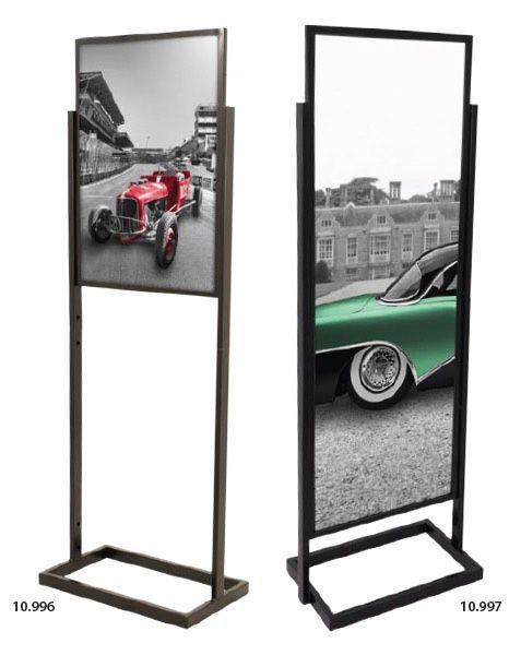 Marco publicitario para exterior Steel Display en un banner publicitario a doble cara fabricado en acero y lacado en color negro, muy fácil de montar, que permite la inclusión de una gráfica publicitaria a doble cara de hasta 9 milímetros de grosor y que está disponible en dos tamaños según referencia (consulte las variaciones).