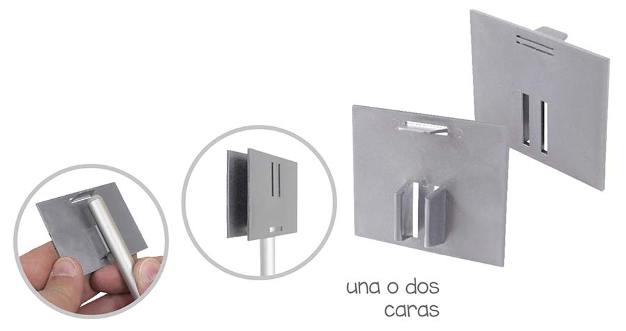 Mini placa para tubo telescópico de Ø10 mm que está fabricada en material plástico ABS gris, para usar con una gráfica publicitaria, cartel, portaprecio, etc. Para colocar la Mini Tableta a la mitad del poste, rompa la solapa superior. Gracias a su diseño acoplable, es ideal para utilizar dos paneles juntos y crear una pantalla de doble cara para su gráfica publicitaria. Sistemas para ambientar y animar los lineales y estanterías.