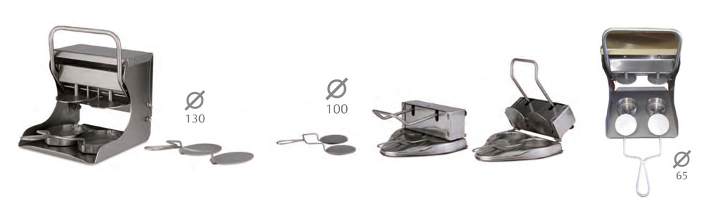 Diámetro 130 mm: Si deseas hacer hamburguesas realmente grandes y generosas, este molde de diámetro 130 mm es la elección perfecta. Con este tamaño, podrás crear hamburguesas impresionantes que satisfarán hasta el apetito más voraz. La máquina inoxidable asociada a este molde tiene unas medidas más grandes, con dimensiones de 410 (L) x 250 (A) x 260 (H) milímetros, y un peso de 6 kilos.