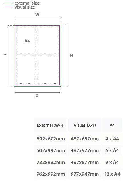 Referencia HRM10329 con medidas totales de 502 (W) x 672 (H) mm, tamaño visual de 487 (X) x 657 (Y) mm, equivalentes a 4 hojas A4.