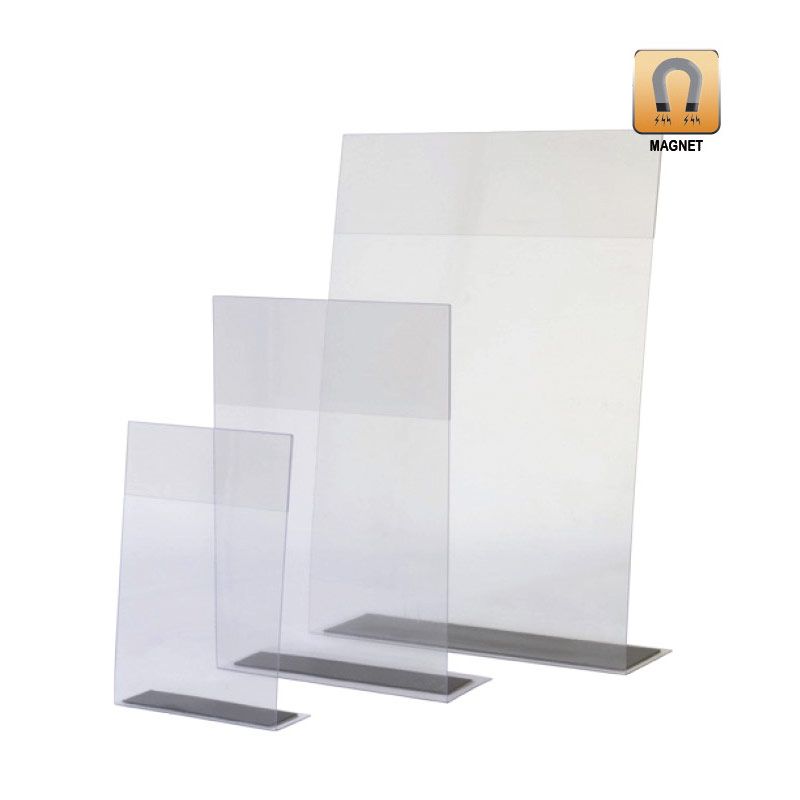 Al disponer de imán en los dos lados, permite colocarse y mostrar la gráfica de publicidad en múltiples sitios. Esta porta gráfica está hecha de PVC y tiene una forma de «L» y 3 tamaños con orientación vertical. Además, tiene una banda magnética para fijarlo sobre superficies metálicas. Ideal como herramienta de marketing para toda una gama de negocios.