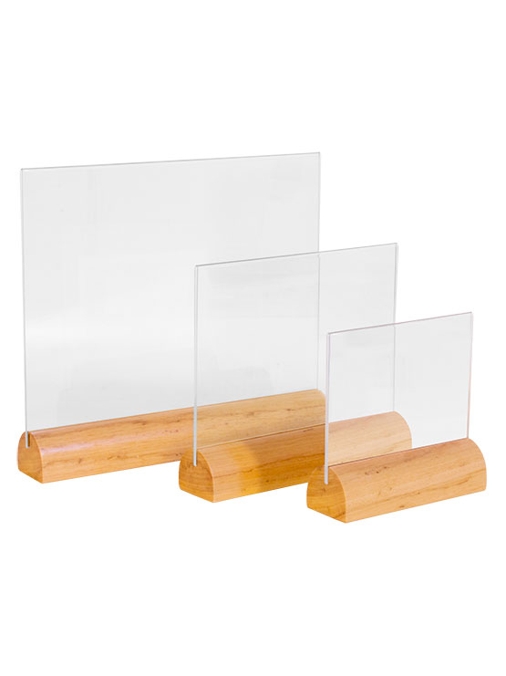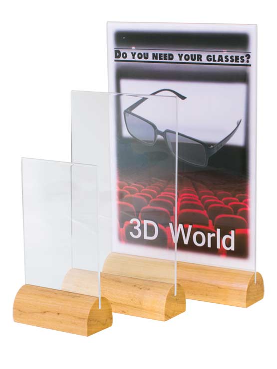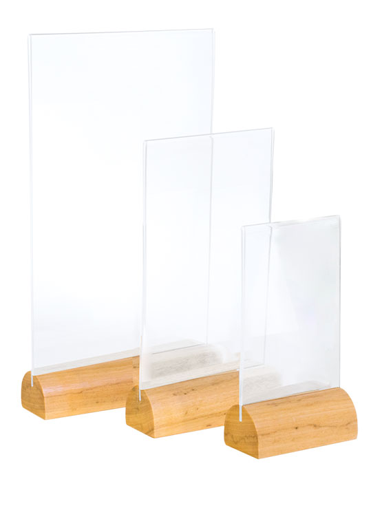 Portamenus Madera Base Ovalada. Material acrílico. Formato vertical y formato apaisado. Buena visibilidad para su publicidad, ofertas, menús, cartas, etc.