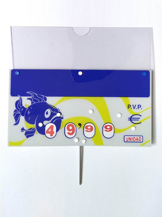 Revise las imágenes asociadas a este porta precio para apreciar en detalle la información descrita, el diseño, el pincho y el sistema numérico de ruedas de la parte trasera. Para cualquier información adicional, duda o consulta, escríbanos un correo. Para ello utilice el formulario de contacto de nuestra web o llámenos por teléfono.