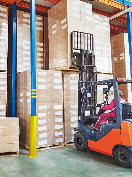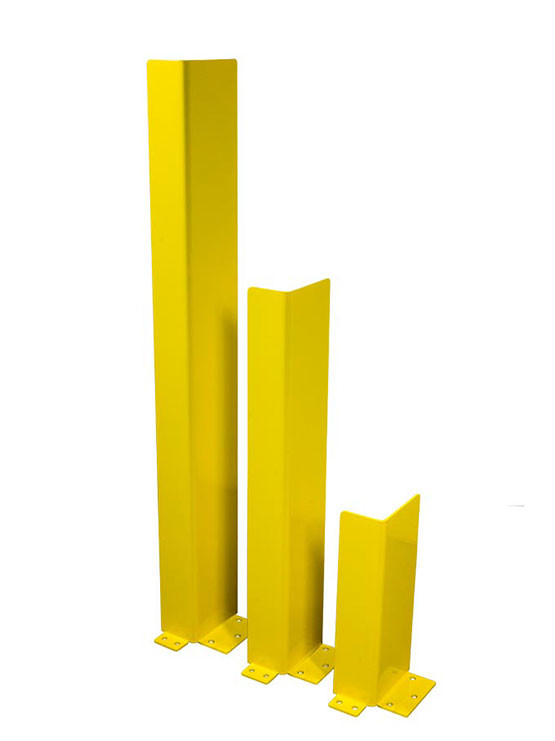 Protectores en L fabricados en acero galvanizado pintado epoxi en color amarillo, y que son ideales para la protección de postes y estanterías contra los choques de las máquinas de mantenimiento en el almacén.