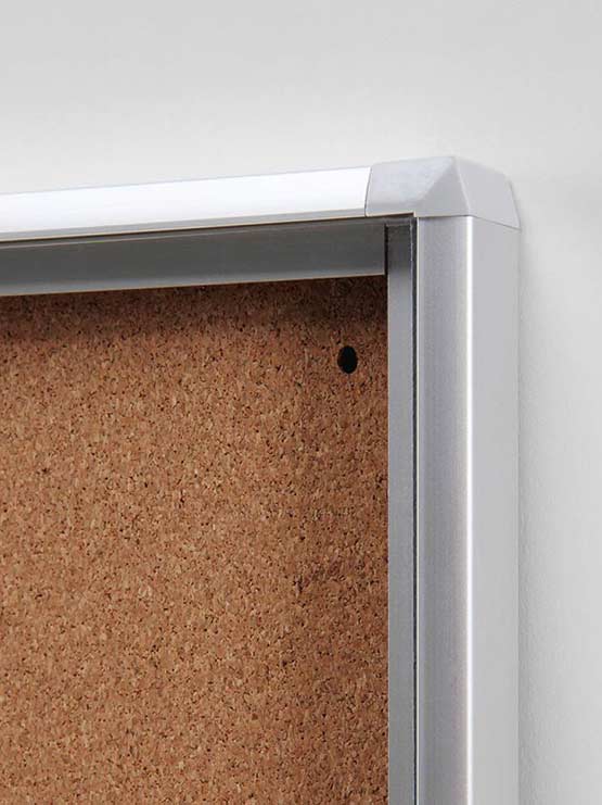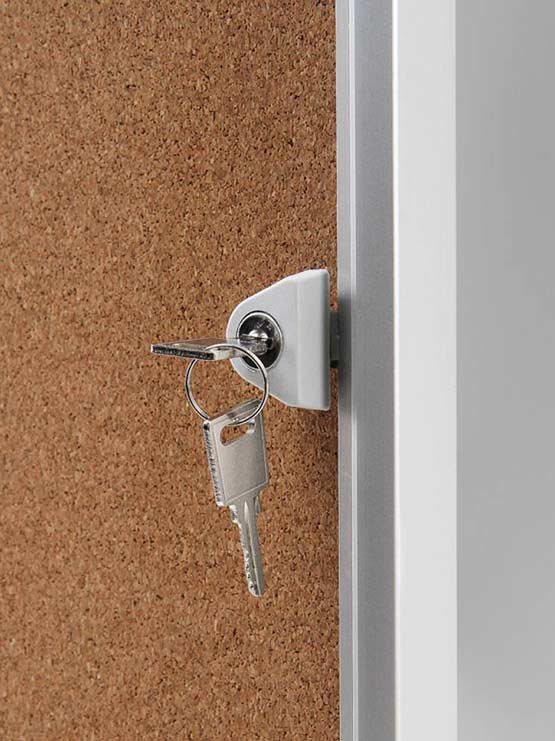 Vitrina de corcho económica para interior. Tablón de anuncios de corcho para interior con cerradura. Tablero de corcho natural con trasera metálica para uso con chinchetas. Con puertas de hoja con cerradura y revestimiento plástico resistente a los impactos. Revestimiento plástico resistente a los impactos.