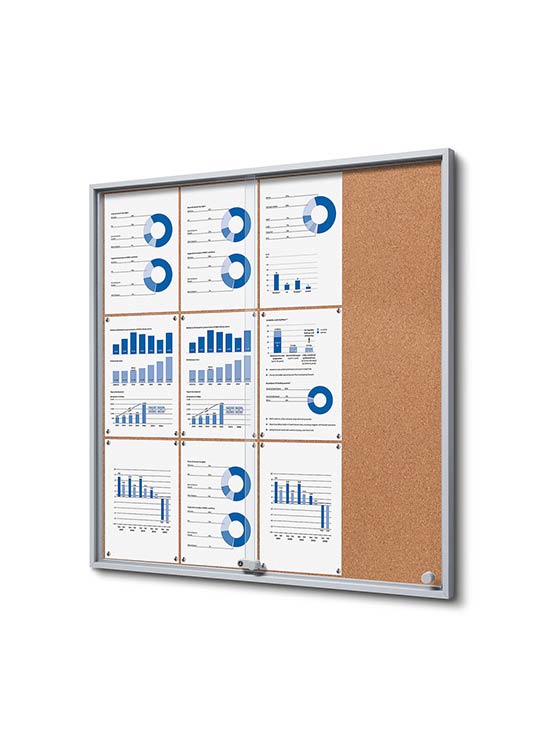 Vitrina puertas correderas corcho económica para interior. Tablón de anuncios de corcho para interior con cerradura. Tablero de corcho natural con trasera metálica para uso con chinchetas. Con puertas de hoja con cerradura y revestimiento plástico resistente a los impactos con certificado de vidrio de seguridad ESG EN12150. Esta vitrina dispone del perfil SLG (revise las imágenes adjuntas).