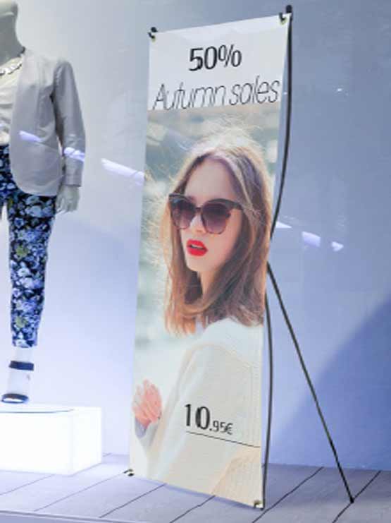 Este banner publicitario es un reclamo perfecto para exponer ofertas…en las zonas de paso de transeúntes. Son soportes diseñados para uso interior, ya que son ligeros y no están diseñados para soportar condiciones climatológicas adversas. Garantizan una imagen atractiva de tu marca o negocio, además de ser un soporte muy económico, permite cambiar y reutilizar las gráficas siempre que se necesite. Son muy utilizados también en todo tipo de eventos familiares como bodas, comuniones y son utilizados como photocall, en él sus invitados pueden hacerse fotos con uno solo o montando varias unidades unas al lado de las otras. Se montan rápidamente y se transportan de forma cómoda dentro de su bolsa de transporte. Si buscas un soporte para destacar tu marca o realizar promociones cerca de tu negocio este tipo de “X-Banners“ son el soporte indicado para ello.
